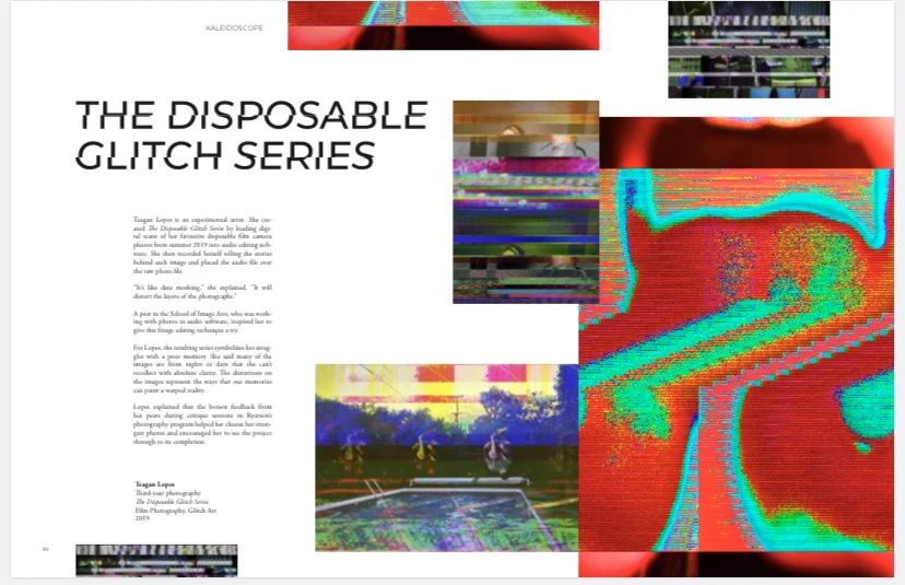 The Disposable Glitch Series is a collection of images which have all been distorted beyond recognition through an experimental editing process using audio and voice recordings. Inspired by Rosa Menkman’s work, the decomposition of the images shows a degeneration on the image to have evolved into an unreadable version of its original state. The original photographs revolve around people in my life and how quickly they come and go within it.